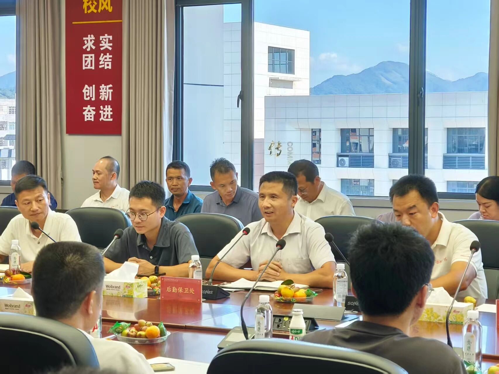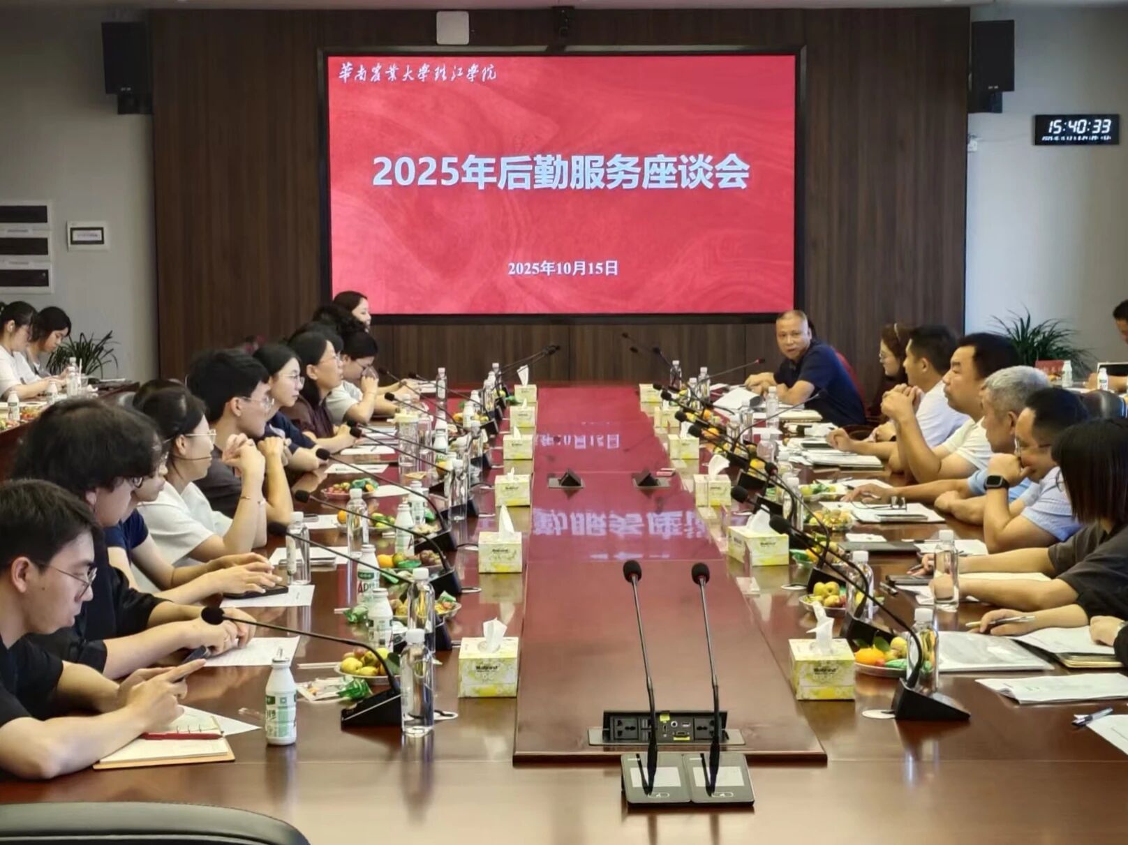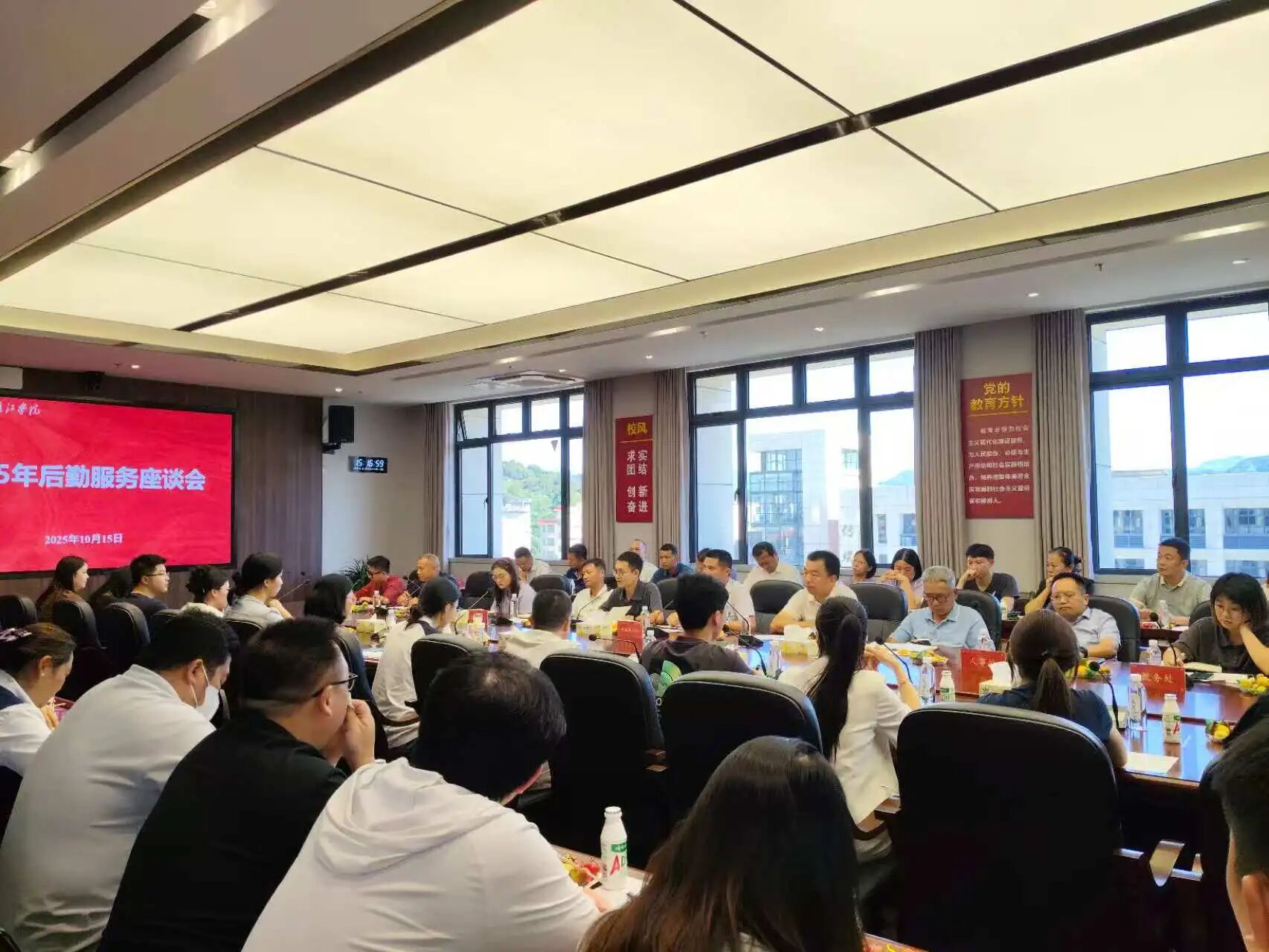 为进一步提升校园生活的质量与满意度,营造更加和谐美好的学习与生活环境。2025年10月15日,后勤保卫处组织召开后勤服务座谈会,本次会议邀请了后勤保卫处、学生处、基建办、教务处、图文信息中心相关人员及各二级学院教师代表、学生代表共同参会,为校园后勤服务的优化建言献策。